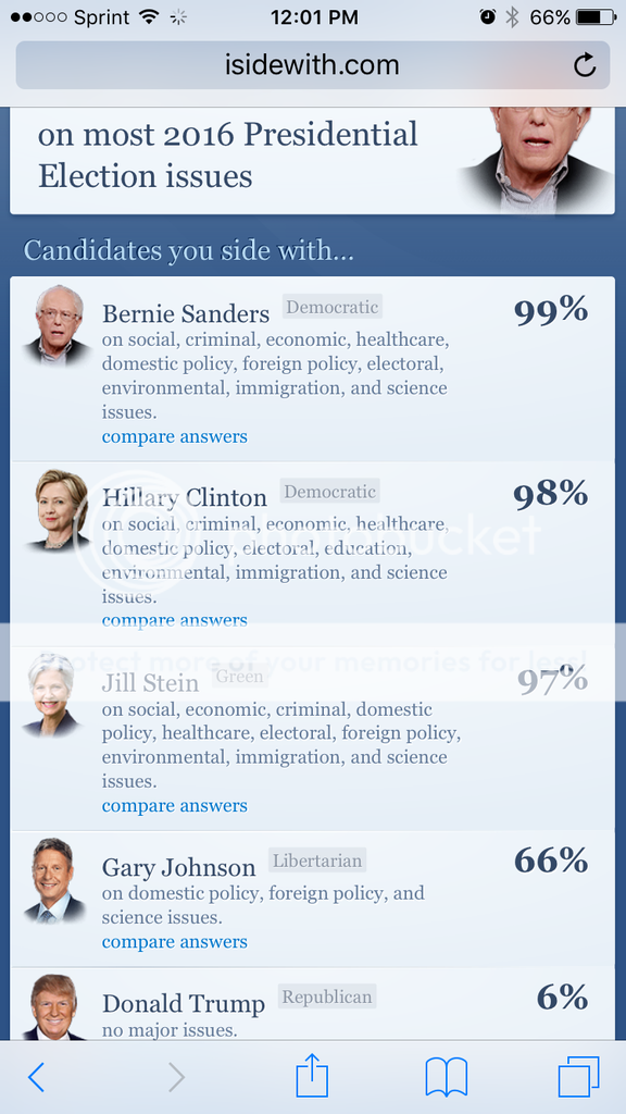 And to the loons saying there is no difference between Trump and Hillary, I dare you to take the quiz and then still claim that. For me, 98% with Hillary, 6% with Trump, the difference couldn't be bigger.
