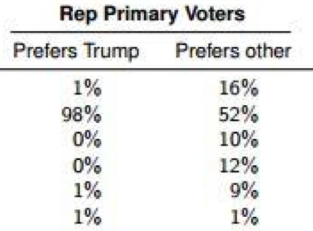 Trump struggling with non-Trump GOP primary voters. Winning 52%, with 16% taking Hillary, 10% Johnson, 12% other.