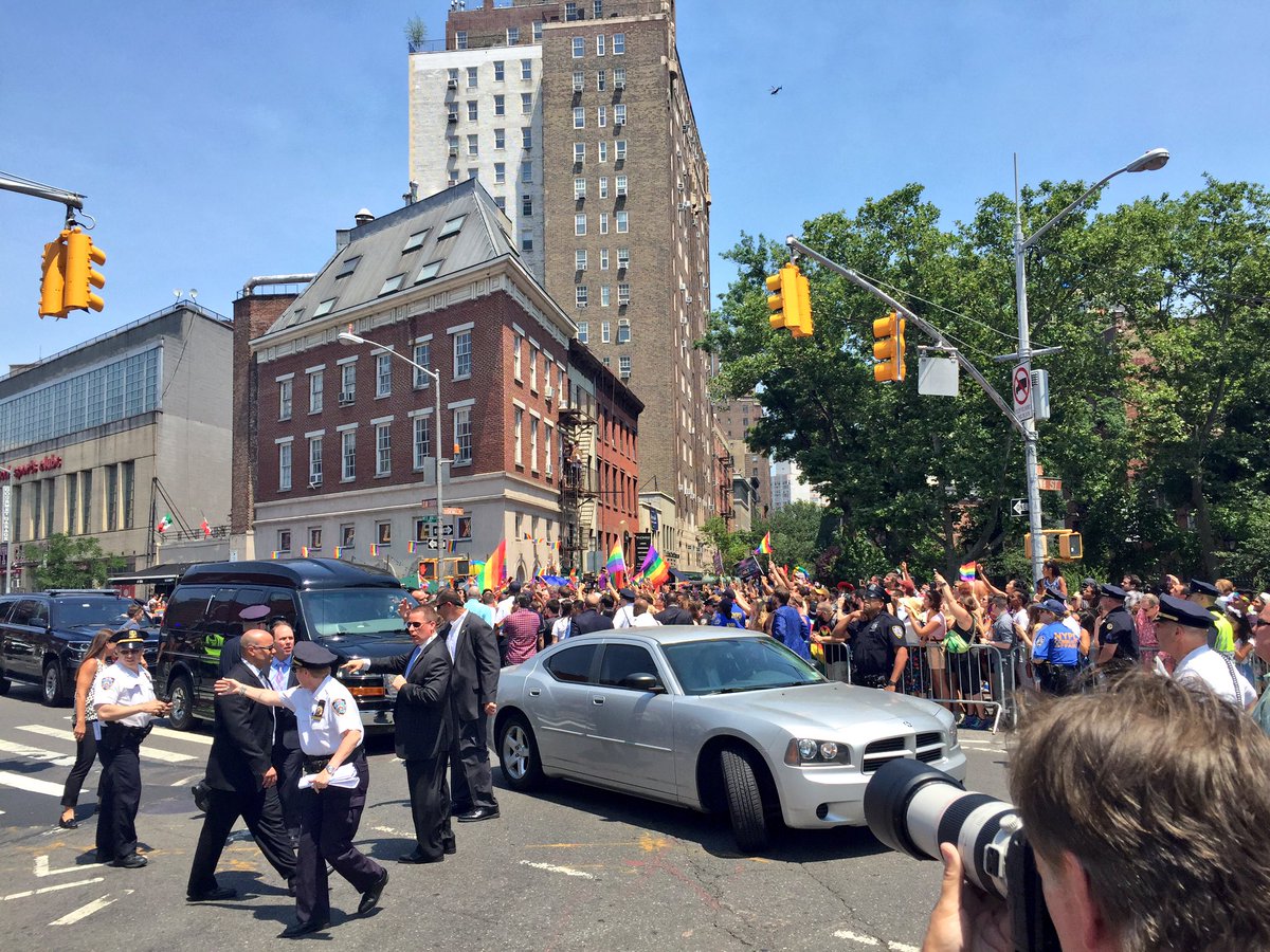 HRC just arrived at the #NYCPride parade, about a block from Stonewall. She's marching to the end of the route.