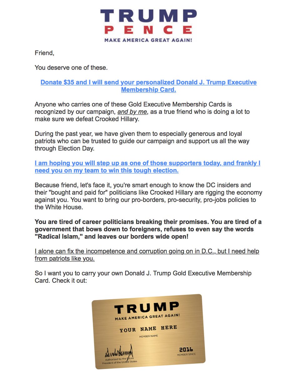 Trumps campaign offered more evidence for this theory on Tuesday afternoon, when it sent out a fundraiser email that offered donors a chance to get their very own gold Donald J. Trump Gold Executive Membership Card if they shell out cash to the campaign.