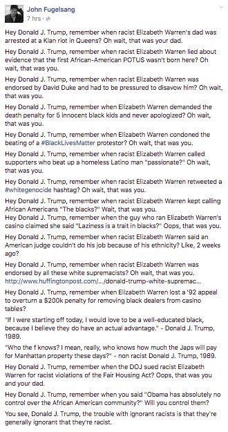 Hey Donald J. Trump, remember when racist Elizabeth Warren called supporters who beat up a homeless Latino man "passionate?" Oh wait, that was you.