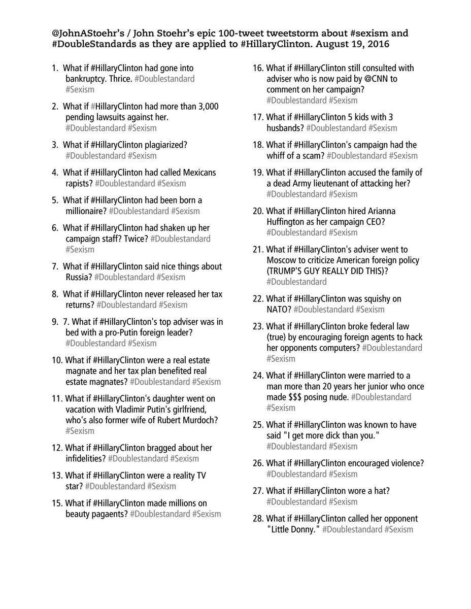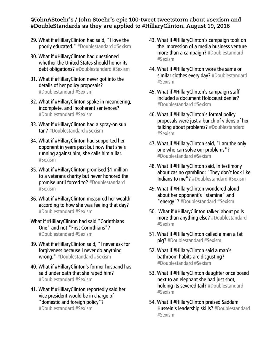 (90,017 posts)Reminds me of this list of 100 #doublestandard items that asked - what if Hillary had done this shit?