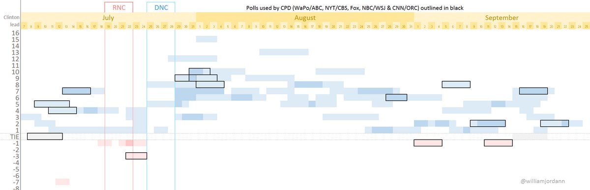 Position of poll on y axis is size of Clinton Lead. Intensity of color of boxes is number of polls in field on that interval.