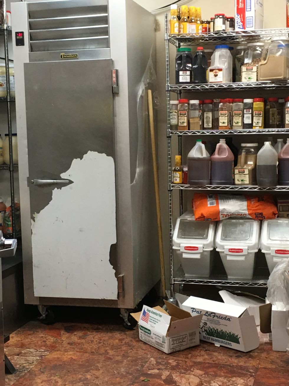 And I bet if we looked inside the fridge we'd see cooked meat stored below raw meat. Or even co-mingled. Definitely don't eat anything here.