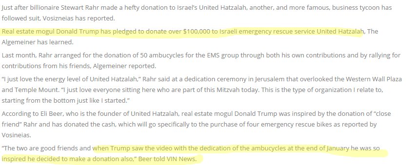 3/In 2014, @realDonaldTrump pledged $100K to @UnitedHatzalah, an Israeli EMS service. Did he pay? No $ from Trump Fdn. U.H. no-commented.