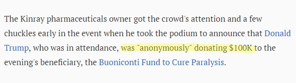 4/In 2010, buddy Stewart Rahr "volunteered" Trump for a $100K gift to the Buoniconti Project. Did he pay? Dunno. Trump Fdn. didn't.