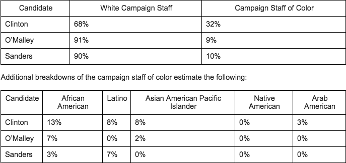 According to a new report out from Inclusv, a DC-based non-profit that helps identify campaign talent from diverse backgrounds, Sanders and OMalley have retained few non-white staffers. A full 90 percent of the Sanders staff is white. The senator from Vermont, who touts 50 years in the civil rights movement and even marched with Dr. Martin Luther King, employs a team that is a mere 3 percent African American. OMalleys team in 91 percent white, with only 7 percent black staff. As of the June 30 reporting deadline, the Clinton camp was 68 percent white and 13 percent black.