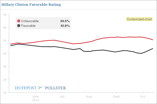 And by the way her negatives have been dropping and positives increasing recently. Here is latest graph from HuffPollster customized to show just last 5 months and with less smoothing option..