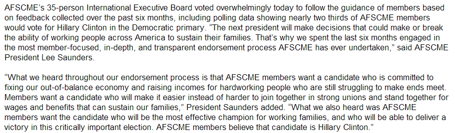 "Members want a candidate who will make it easier instead of harder to join together in strong unions and stand together for wages and benefits that can sustain our families," he said. "What we also heard was AFSCME members want the candidate who will be the most effective champion for working families, and who will be able to deliver a victory in this critically important election. AFSCME members believe that candidate is Hillary Clinton."