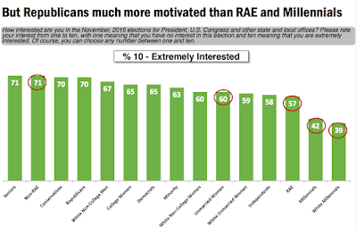 Greg Sargent raised the warning signals, based on a new poll released yesterday by Stan Greenberg, that core Democratic voters-- particularly millennials (but also unmarried women and minorities-- are not as energized by the 2016 elections yet as core Republican voters. Perhaps that's because anti-establishment Democrats have come to the conclusion that their party's horribly flawed establishment candidate is inevitable, while Republicans have all but vanquished her equivalent (Jeb) and will probably pick an altogether anti-establishment candidate, if not "outsiders" Trump or Carson, then Texas neo-fascist Ted Cruz.