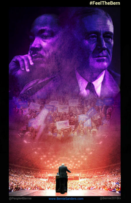 Which, the Bernie image does. It simply has FDR and MLK above him, which invokes that he is continuing their legacy. They aren't being cartooned onto his logo in a brand selling way.