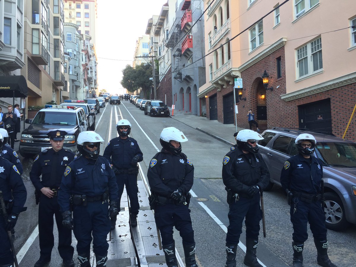 San Fran Police Department officers stopping protesters from walking in front of the #CLOONEY fundraiser. #berN