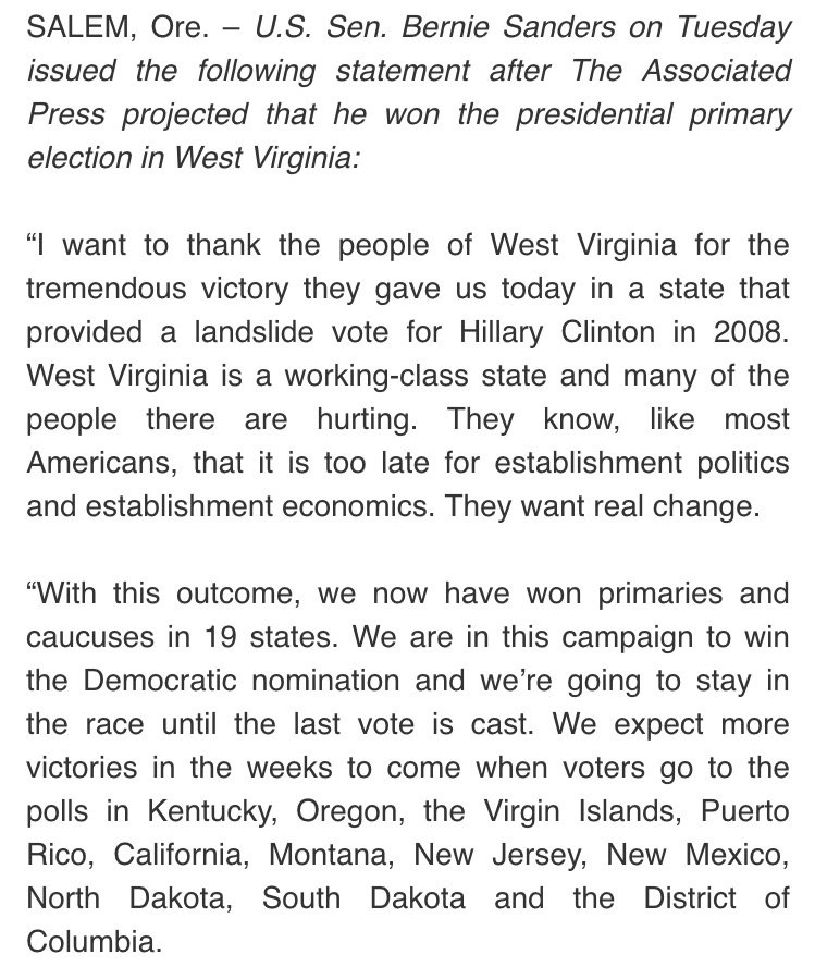 Sen. Sanders' statement on winning West Virginia and pics from Oregon (Original Post)