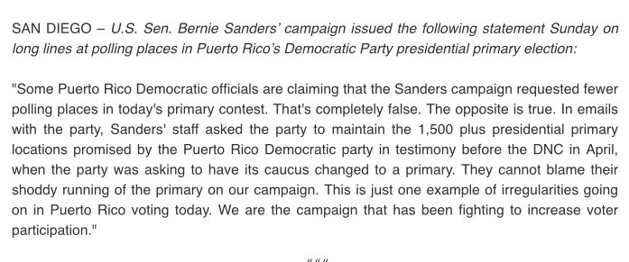 Bernie Sanders' Campaign Statement on long lines Puerto Rico: (Original Post) Donkees Jun 2016 OP