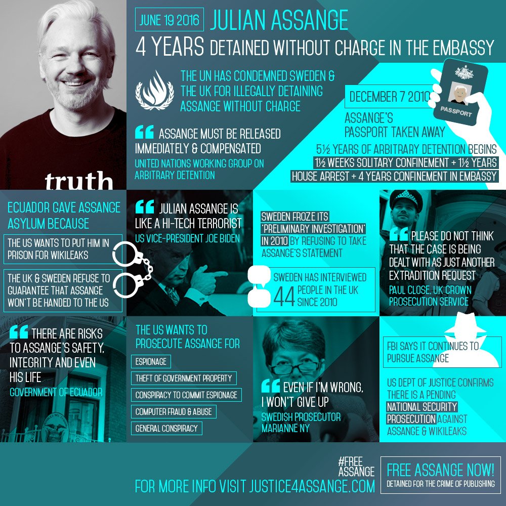 Tomorrow June 19—Julian Assange 4 years detained without charge in the embassy http://freeassangenow.org #FreeAssange