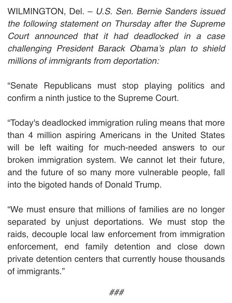 Bernie Sanders releases a statement on today's #SCOTUS immigration decision. (Original Post) Donkees Jun 2016 OP