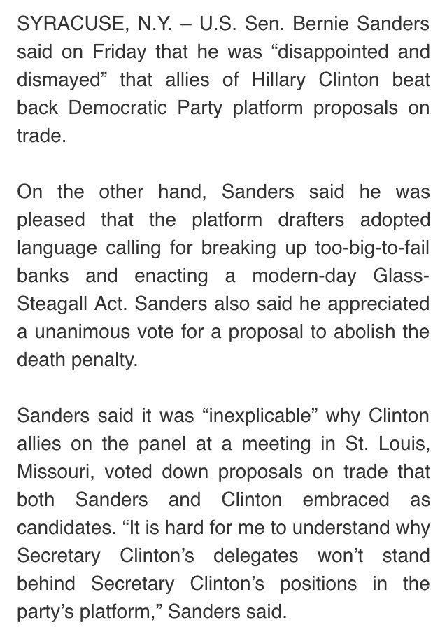 Bernie Sanders on drafting committee. "Disappointed" on trade. "Pleased" abt modern Glass-Steagall.. (Original Post) Donkees Jun 2016 OP