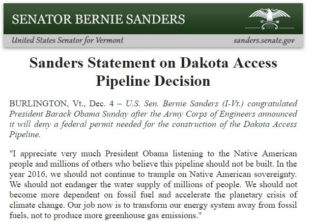 Bernie Sanders Statement on Dakota Access Pipeline Decision (Original Post)
