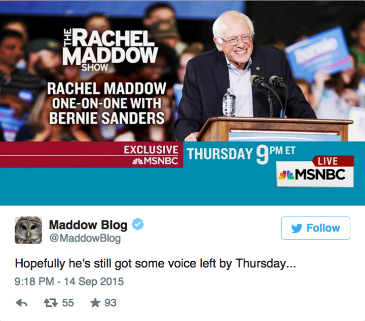 This Thursday!! Rachel Maddow one-on-one with Bernie!! (Original Post) Playinghardball Sep 2015 OP