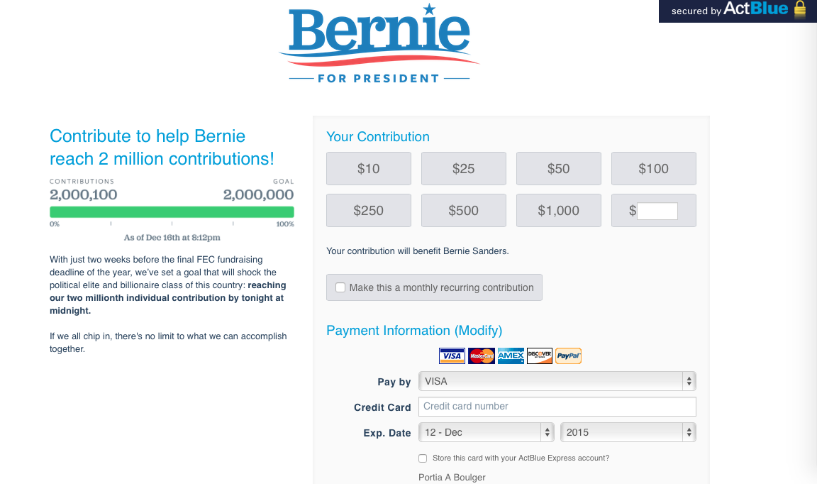 http://berniepost.com/2015/12/sanders-passes-2-million-individual-contributions/Presidential candidate Bernie Sanders received his two-millionth individual campaign contribution on Wednesday night.