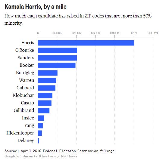 In the early months of the 2020 Democratic presidential primary, Harris has tapped into the wealth of minority communities in pockets across the country, from her home in the San Francisco Bay area to Los Angeles, Houston, Atlanta, Cleveland, South Florida and the Washington suburbs, and she has taken in more than twice the amount of her closest competitor from big-dollar contributors who live in neighborhoods in which minorities make up a majority of the population, according to an NBC News analysis.