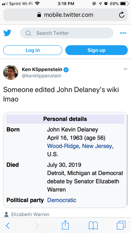 John Delaney's Wikipedia vandalized to say he died at the Democratic debate (Original Post)