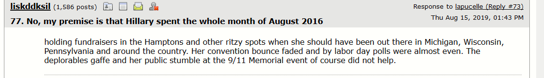 (2,753 posts)holding fundraisers in the Hamptons and other ritzy spots when she should have been out there in Michigan, Wisconsin, Pennsylvania and around the country. Her convention bounce faded and by labor day polls were almost even. The deplorables gaffe and her public stumble at the 9/11 Memorial event of course did not help.