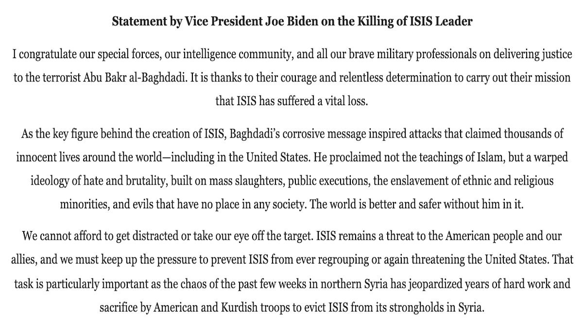 On the other hand Joe Biden explicitly congratulated "our special forces, our intelligence community, and all our brave military professionals", the people who DID do the job.