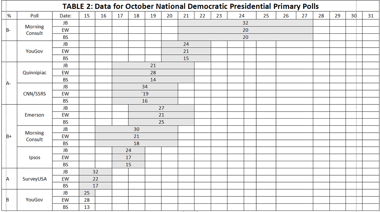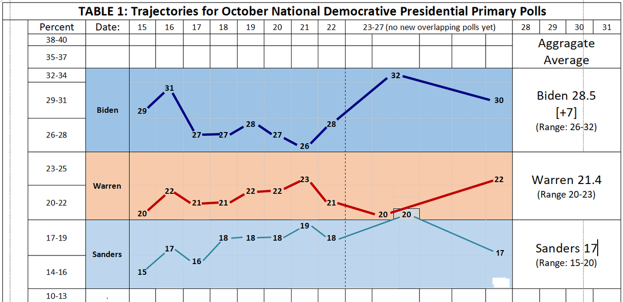 This is a work in progress. A & B rated polls(538) are tracked with day-by-day averages of polls available for each day with an aggregate average as given above. This provides a daily tracking so that trends can be seen rather than simply lumping all polls together with arbitrary listing of the number of polls covered. I am going from the October Debate until the November debate. However, aggregate averages can be made at any point.