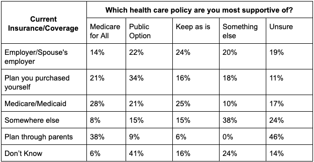 (126,251 posts)those already on Medicare/Medicaid and those on their parents policies. M4A loses to the public option or keep things the same among those who have employer based coverage and those who purchased their own plans. Nearly half of those who have health care coverage through their parents are unsure which plan they support. Considering that the youth demographic is the least likely to show up and vote, it leads me to believe that the number that support Bernie or Warren is skewed upward.