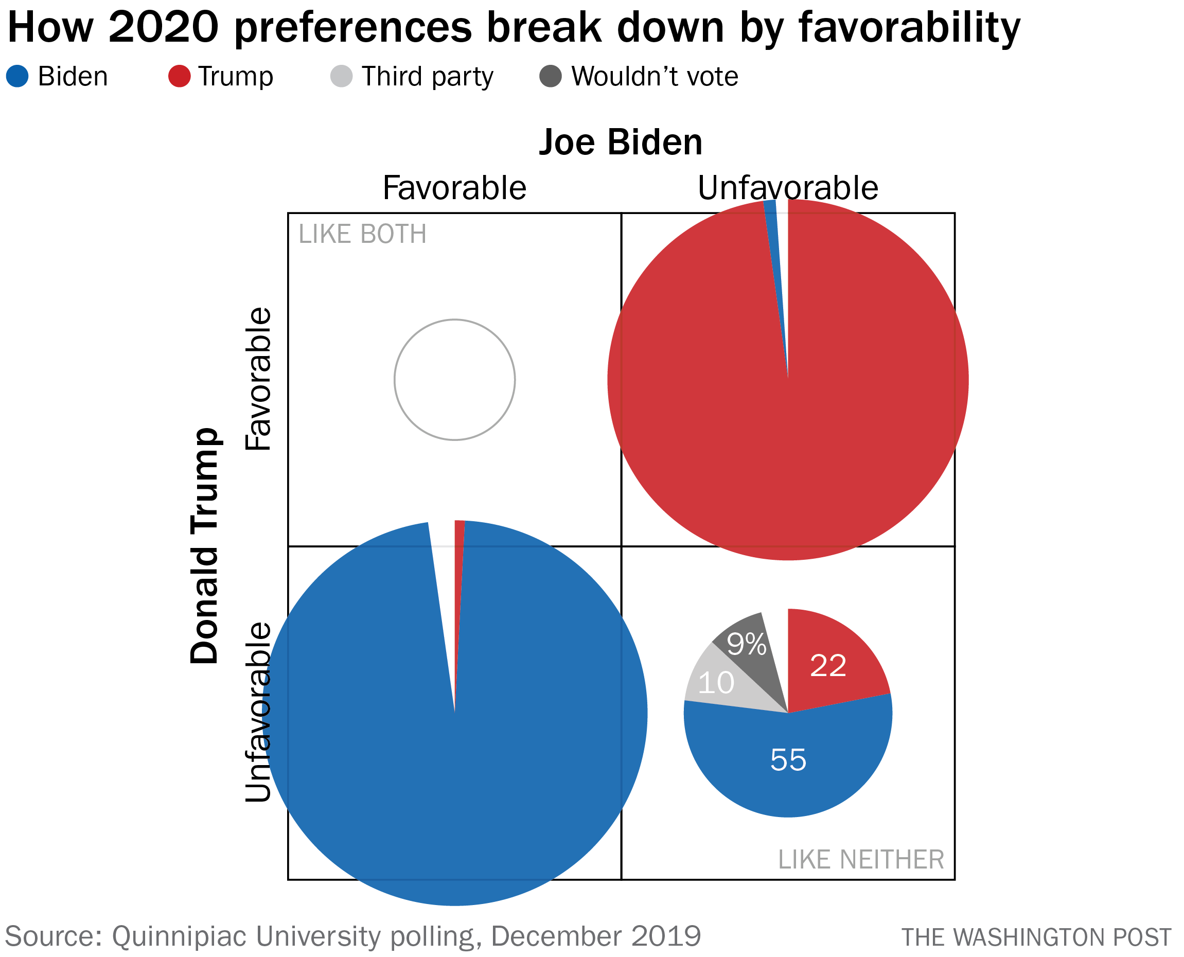 What we see when we compare those numbers to 2016 is a flip in sentiment among the cynical voters. That year, Trumps support among the like-neithers was about the same as his overall percentage; it was Clinton whose numbers plunged. In Quinnipiacs poll, Biden holds strong with that group, while Trumps numbers drop off a cliff.