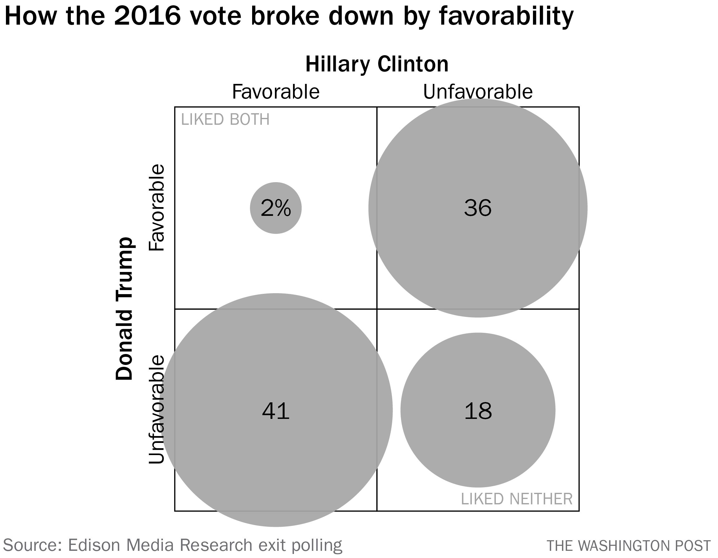 Sure, partisans are generally enthusiastic about their partys nominee, but in 2016, given how unpopular both candidates were, a sizable number of voters who cast ballots said they liked neither Donald Trump nor Hillary Clinton. According to exit polling conducted that year, about 1 in 5 voters said they liked neither Trump nor Clinton, about nine times as many as said they liked both major-party candidates.