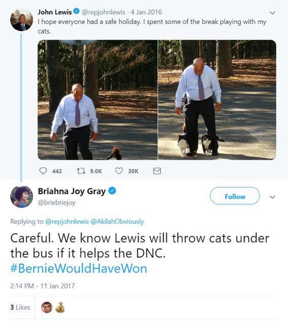 I have no problem with reminding people what Bri Bri thought about John Lewis when he was healthy, so they've got context when the eventual hollow best-wishes come from Bernie and his campaign. If I were more cynical, I might even believe that the eventual best-wishes might be pandering to the AA community, to try to boost Bernie's god-awful standing with black voters.