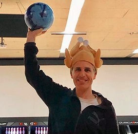 He was actually out bowling with friends and a comfortable-enough liar to post this picture of his busy night "tending a sick child".