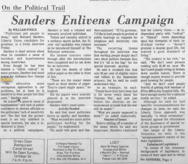 Related: About this forumThe Brattleboro Reformer: "Sanders Had Some Praise for Alabama Governor George Wallace"