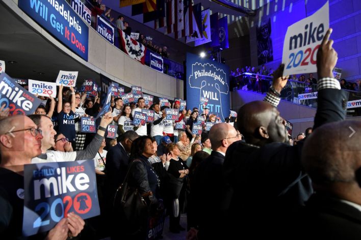 On Tuesday night, Bloomberg rented the entire Constitution Center and spoke from an elevated lectern in the center of the lobby to supporters surrounding him on the floor and on the upper level. The campaign spared no expense, with catered food, wine, a DJ, and lighting design cast onto the ceiling. Signs reading Philadelphia Will Get It Done a play on his Mike Will Get It Done TV ads and PA Likes Mike were hung around the grand hall.