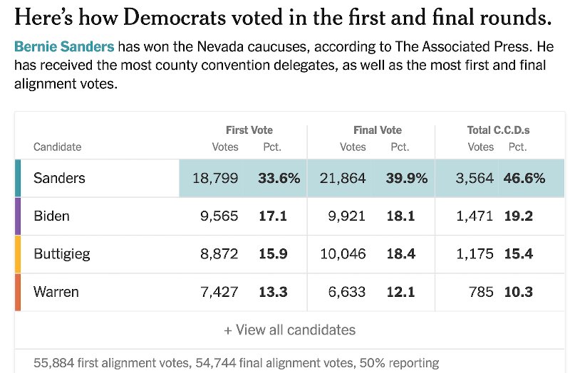But so many people here seem to assume that if a moderate dropped out, those votes would overwhelmingly go to another moderate. But in Nevada, the tallies so far show that, after the first alignment where a number of moderates are not viable, it is Sanders who is by far the greatest beneficiary of where their supporters go when they can no longer support their first choice (at least so far).