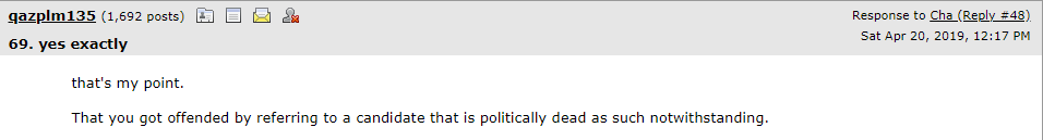 That you got offended by referring to a candidate that is politically dead as such notwithstanding.