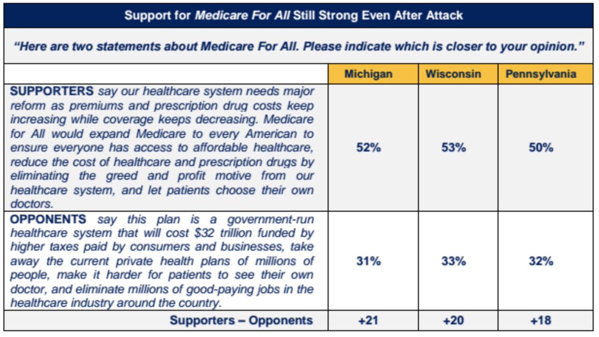 Some data points the campaign highlighted include that, across all three states, a majority of voters believe the country is on the wrong track, disapprove of Trump's handling of the job, and support Medicare for All a platform that's becoming increasingly popular among Democratic presidential candidates.