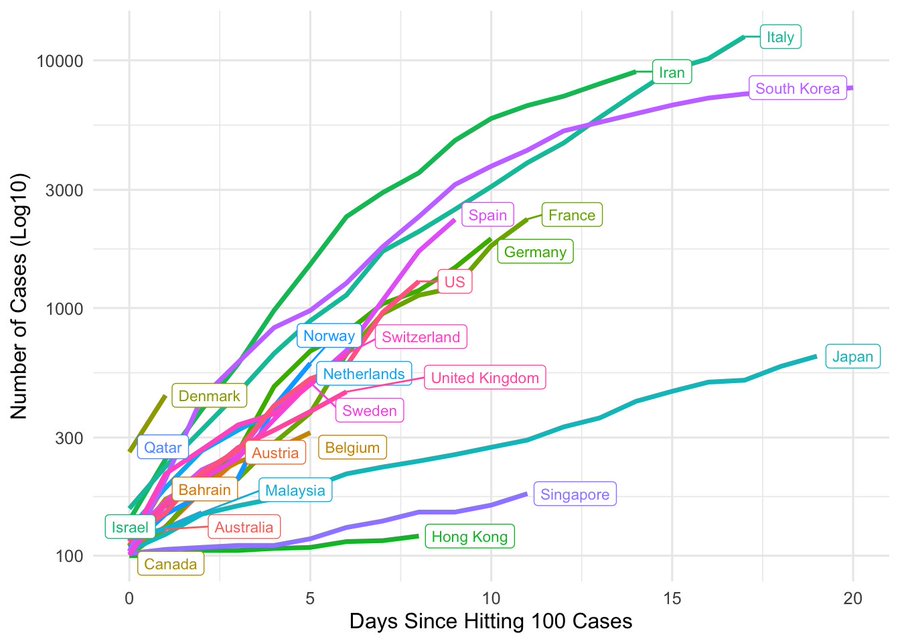 graphic (right) nicely summarizes why the entire #Trump Administration #COVID19 policy, which rests on little more at the moment, in practical terms, than travel bans, is doomed to fail. Graphic on left shows USA is on Italy trajectory, lagging about 7-10 days behind.
