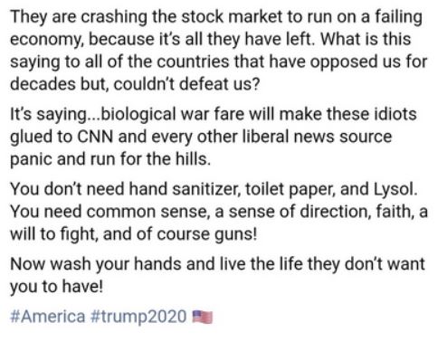 https://www.joemygod.com/2020/04/tx-woman-dies-of-covid-after-posting-facebook-rant-you-dont-need-sanitizer-you-need-faith-and-guns/?__cf_chl_jschl_tk__=9285a6b065c2ace404fb5b6be102303a25f90a0e-1586187031-0-ASxFhJ7oEmfUMWx6jRZv4xjp9rOZ7fQOMF7DUt7vVRBCaqYw3G6T852YWxiHwP8qvtUrrj5xY2xGMeuttwrcVzQXgCSP9vX4f4suiuavsHDCoDyfJzhmXszwExUZV_xbFGKnQKaWa_9n9BZcx6EUF_YHTfuEryETBqNHQGbDdCq5zQqNP3xudgrYMLkD2_VERFeTfhp__nd7XU9C7jK_jfO5U-dhV4SGVPopHPk41eTOKEmBhhet7vJrWcrYzS98PjKJUqjpnrIUDCN_1UNK_vHZugwFIQJ8JfgARRfdcNMzT3mD_90bh-UjyqhRfv5f7q6mQ3jiG9CJ200DixK_15s-u7C8Fprrppjn2hLdNbNBnJaG0jYvkqtVdXMuKeRylPDI67dvhFMcgng70EeQcKjkpUxReDRSF9AxK99Z67hA