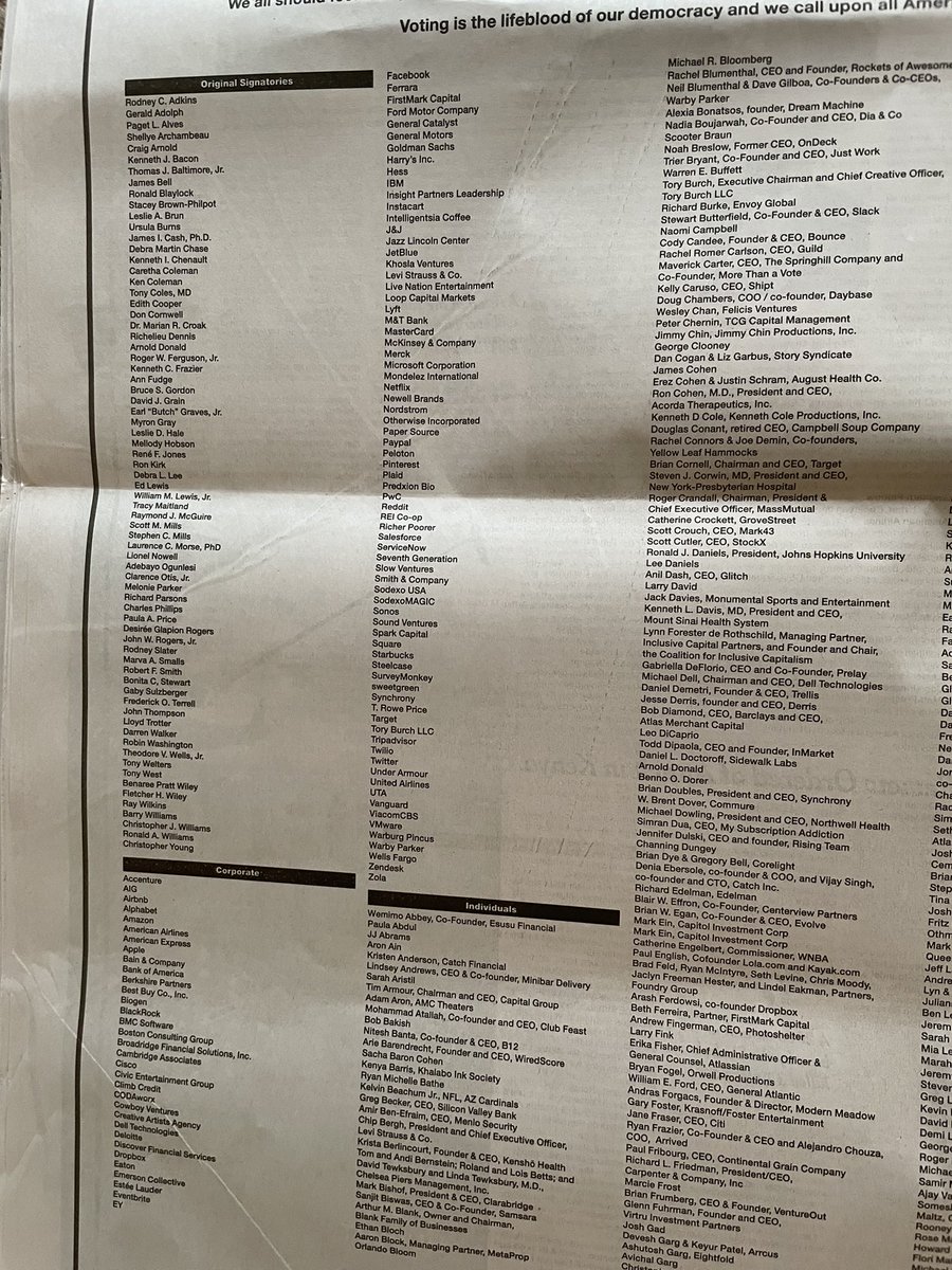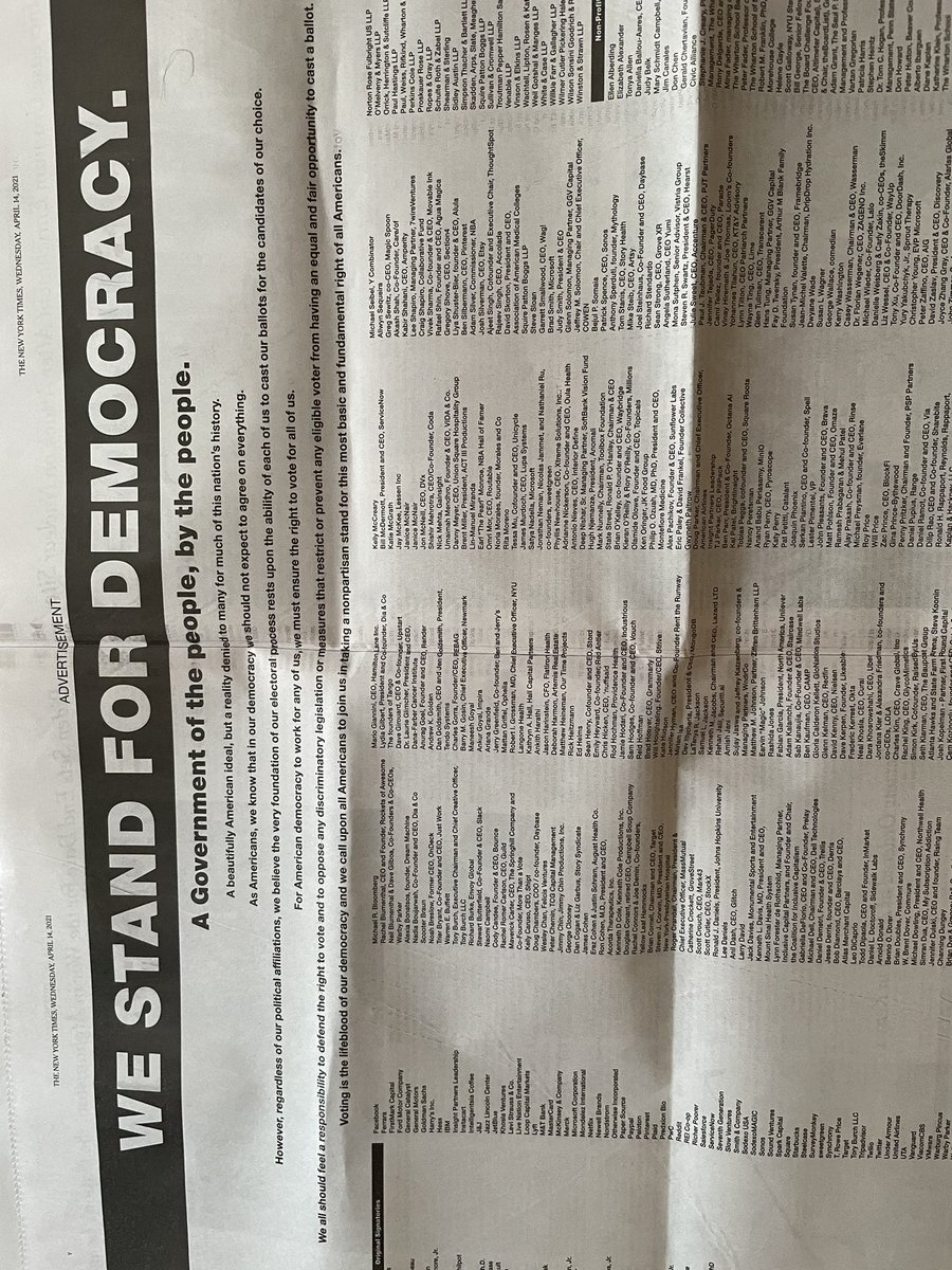 Hundreds of CEOs and more than 110 corporations sign onto effort opposing voting restrictions. Ad taking up 2 full pages in todays New York Times and Washington Post says: For American democracy to work for any of us, we must ensure the right to vote for all of us.