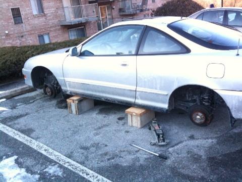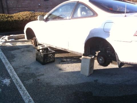 Now, someone had to show up in the middle of a very cold night with enough people and a vehicle to cart off all four wheels.