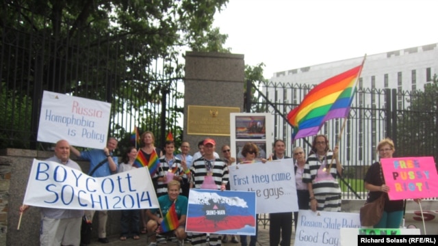 "WASHINGTON -- Activists, Russian-Americans, and other concerned citizens held small demonstrations in front of Russia's missions in Washington and New York on July 31 to protest the country's rapidly deteriorating record on gay rights.
