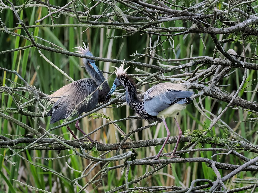 Tri Color Heron pair. Watched them for three days try to build a nest. Obviously a first year pair as neither of them were very good at it. After three days they still didn't have a platform, it kept falling apart.