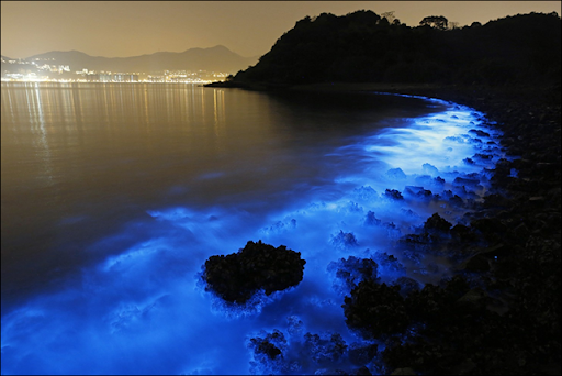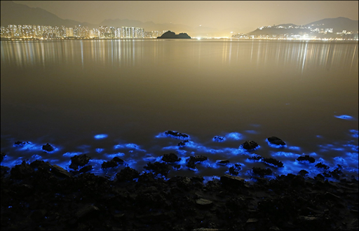 Eerie fluorescent blue patches of water glimmering off Hong Kong's seashore are magnificent, disturbing and potentially toxic, marine biologists say.