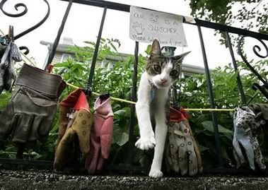 Willy, a 1-year-old cat is photographed Thursday, July 20, 2006, with a display of several pairs of garden gloves that he took from unknown yards in his neighborhood in Pelham, N.Y. Willy has brought home nine pairs of gloves and five singles over several weeks laying them on his owners' front or back porches. (AP Photo/Julie Jacobson) LINK