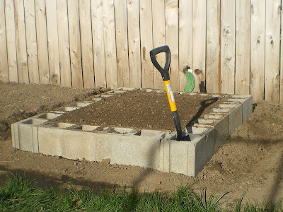 wood and cinder block raised beds under construction