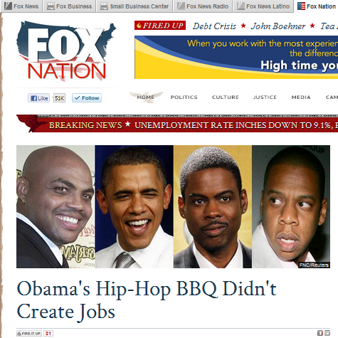 Dog whistle racists throughout America, step the fuck aside, FOX NEWS has out classed all of you with today’s headline “Obama's Hip-Hop BBQ Didn't Create Jobs” which is an article on the President Obama’s 50th Birthday celebration that was held at the White House on Thursday, August 4.