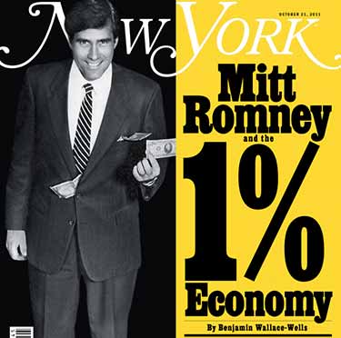 New York Mag has a cover this week that will have the DNC drooling for days. Beyond the cover, the piece by Benjamin Wallace-Wells goes after Romney's wealth and background in as a Master of the Universe.